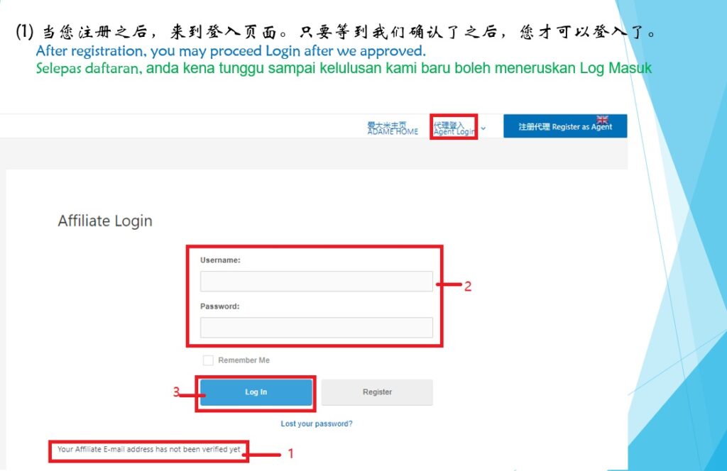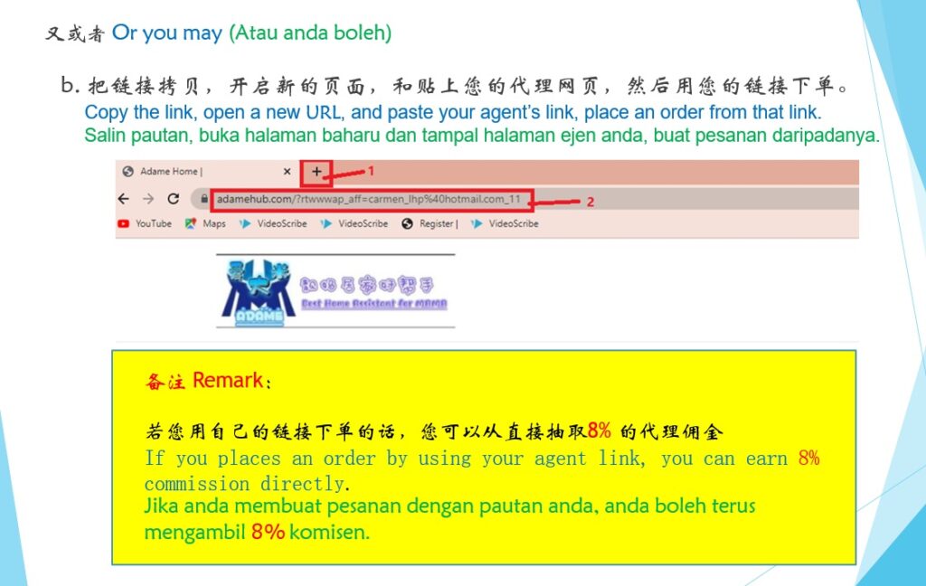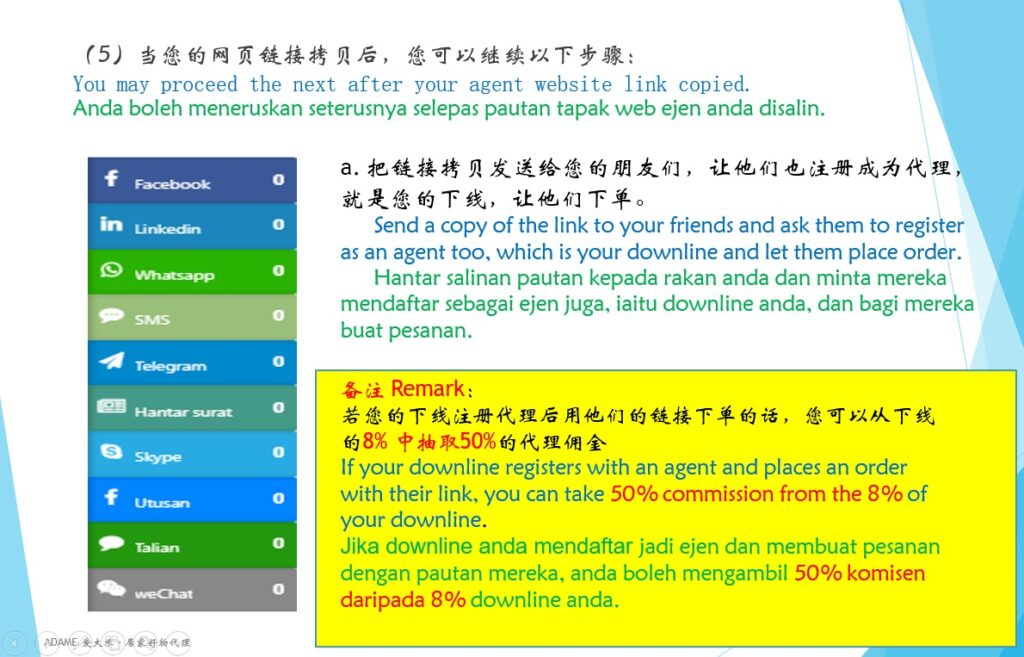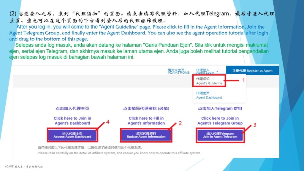 Click here to access Agent's Homepage Access Agent Homepage Click here to Fill in Agent's Information Update Agent Information Click here to join Agent's Telegram Group Join In Agent Telegram Group(Chinese) Join In Agent Telegram Group(English) Join In Agent Telegram Group (Malay) Please read carefully on the detail of Affiliate System, and ensure you know how to operate this affiliate system. How to operate your Affiliate system: 点击此处加入 代理主页 Access Agent Dashboard Click here to Fill in Agent's Information Update Agent Information 点击这里加入 TELEGRAM代理群 Join In Agent Telegram 联系我们 | Contact Us Get In Touch http://www.facebook.com/groups/adame14134/ +(60) 11-6279 4134 34adame134@gmail.com Find Us Follow Us Facebook Whatsapp Notice: JavaScript is required for this content. Share product to your friends